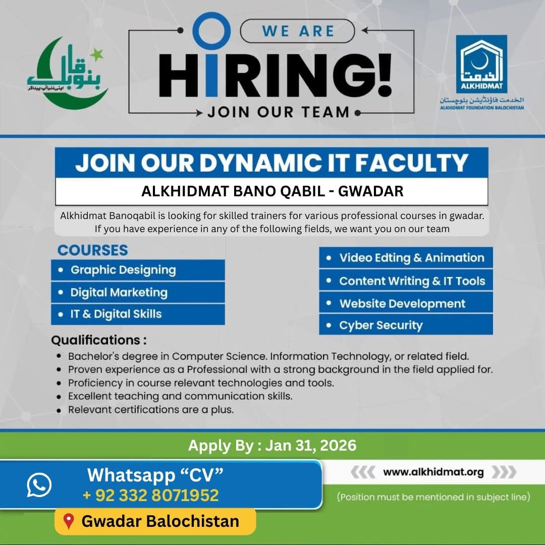 We Are Hiring IT Faculty in Gwadar | Bano Qabil Gwadar | Alkhidmat We Are Hiring IT Faculty in Gwadar…